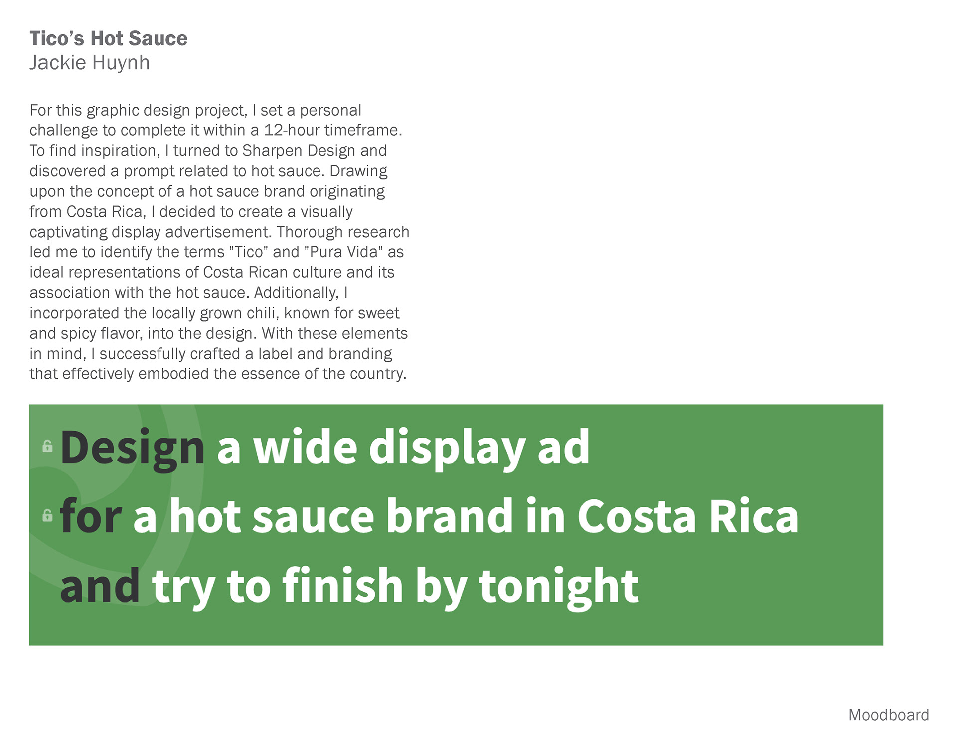 For this graphic design project, I set a personal challenge to complete it within a 12-hour timeframe. To find inspiration, I turned to Sharpen Design and discovered a prompt related to hot sauce. Drawing upon the concept of a hot sauce brand originating from Costa Rica, I decided to create a visually captivating display advertisement. Thorough research led me to identify the terms "Tico" and "Pura Vida" as ideal representations of Costa Rican culture and its association with the hot sauce. Additionally, I incorporated the locally grown chili, known for sweet and spicy flavor, into the design. With these elements in mind, I successfully crafted a label and branding that effectively embodied the essence of the country.